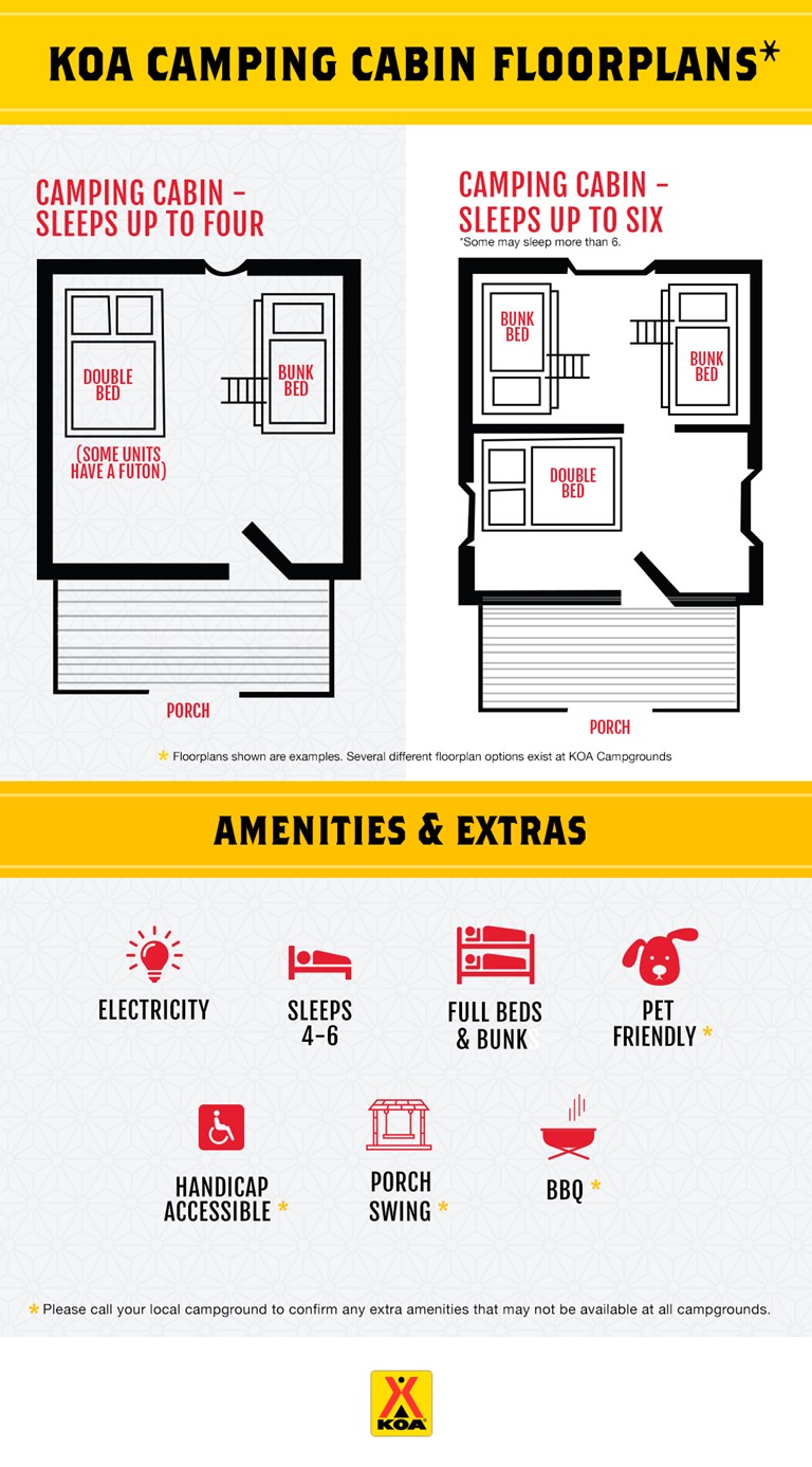 *Please call your local campground to confirm any extra amenities that may not be available at all campgrounds. Cabin floor plans differ.