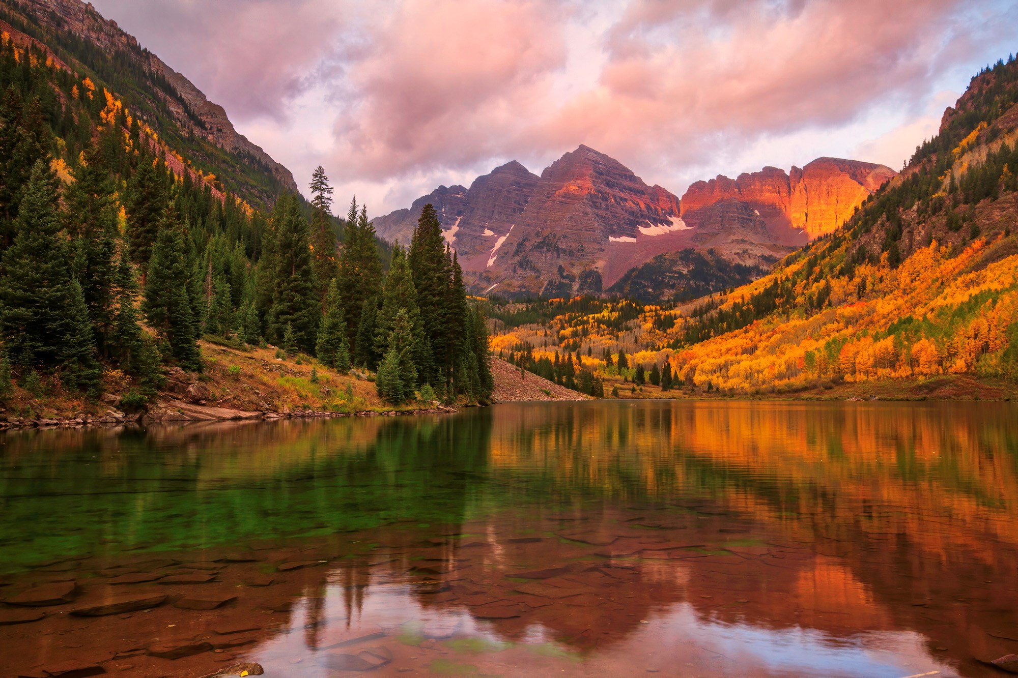 The Maroon Bells, 14,000-foot-high twin peaks, are among Colorado’s most photographed landmarks. Revered for their natural beauty, the Maroon Bells reflect over Maroon Lake. Pet-friendly hiking trails provide endless scenic views of majestic mountains, vast fields of wildflowers and aspen trees.