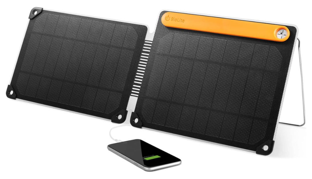The BioLite SolarPanel 10 Plus is the real deal, delivering 10 watts of charging power through a built-in USB-A port. This compact unit features BioLite’s sunlight optimization tech, an integrated bubble level and lighting indicator that lets you know when the panel is perfectly angled towards the sun. It weighs just under a pound, stands up on any flat surface, and can charge a smartphone from zero to full in about two hours in direct sunlight.