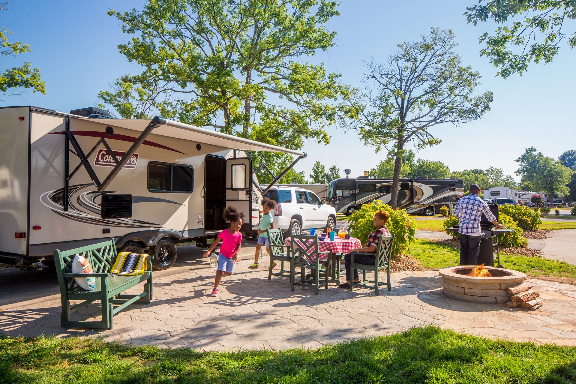 Discover even more room to enjoy outdoor living with a KOA Patio Site®. These spacious sites offer your very own patio equipped with outdoor furniture and the perfect place for a fire. Wake up and enjoy a cup of coffee with the sunrise and spend an evening relaxing with family and friends.