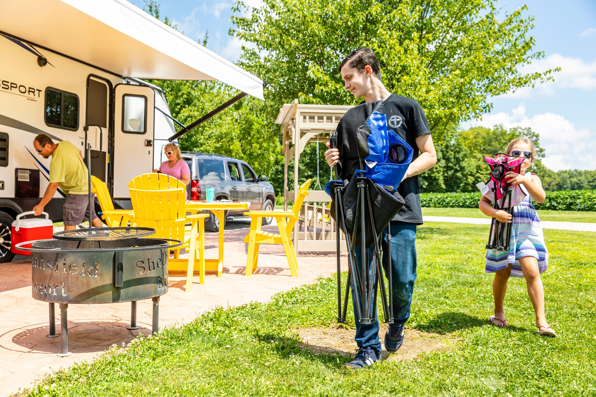 Consider the campsite itself. You may want to book a pull-thru campsite if you are new to driving and parking your RV. These eliminate the stress of backing up your rig. Or, perhaps you want to practice those backing skills before a big trip. In that case, you can get a back-in site. Don’t forget your leveling blocks for a comfortable stay!. You can also Book a Patio Site for the ultimate shakedown experience.