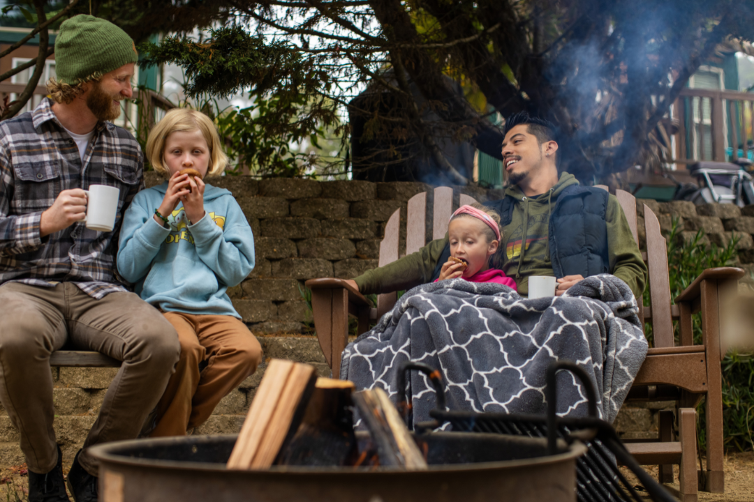 Two men and two kids around a campfire at anta Cruz Monterey KOA